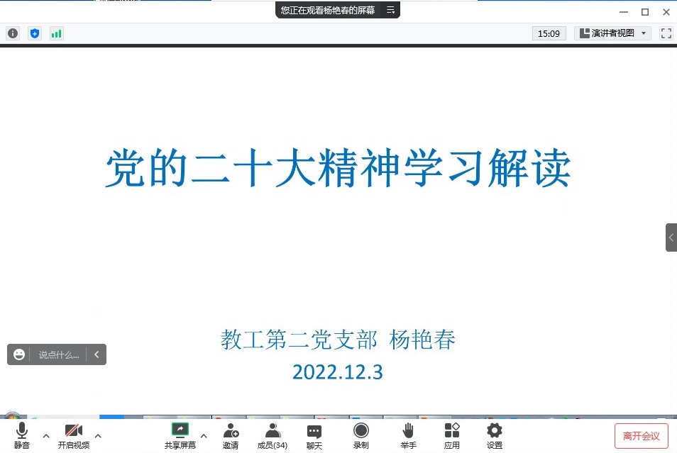 根据学校《关于组织开展党的二十大精神集中宣讲工作的通知》精神,结合学院《关于电子与信息工程学院党委认真学习贯彻党的二十大精神的通知》的相关安排,12月3日下午,电信学院教师党支部书记“双带头人”杨艳春老师线上联系学生支部开展了题为“党的二十大精神学习解读”的专题党课。软件工程专业党支部、计算机科学与技术专业第一党支部、计算机科学与技术专业第二党支部的全体师生党员参加了本次党课。