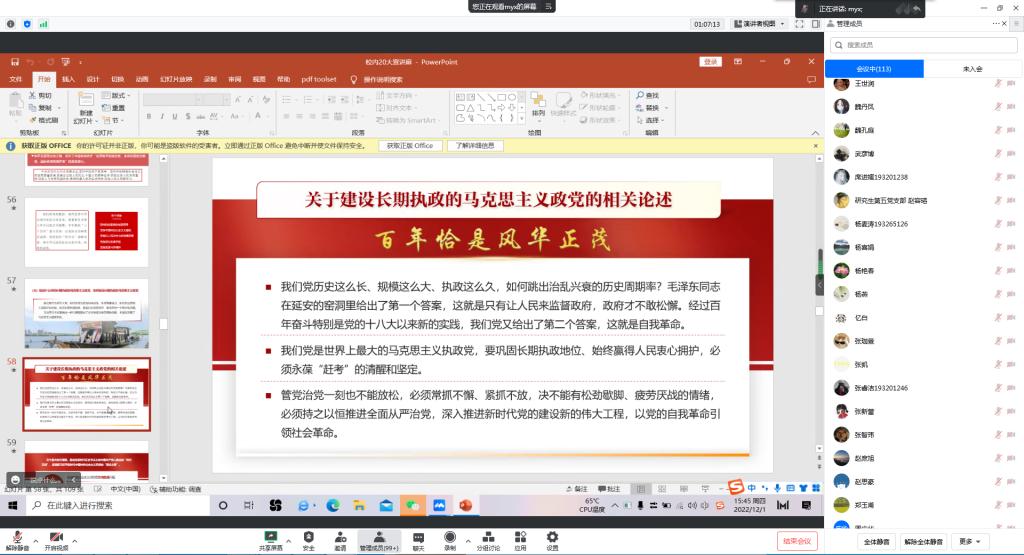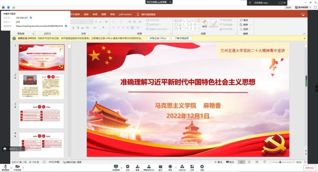 为全面深入学习宣传贯彻党的二十大精神,进一步教育引导学院师生党员把思想统一到党的二十大精神上来,根据《2022年兰州交通大学理论宣讲工作方案》《兰州交通大学学习宣传贯彻党的二十大精神工作方案》要求,结合学院《关于电子与信息工程学院党委认真学习贯彻党的二十大精神的通知》的相关安排,12月1日,马克思主义学院麻艳香教授受邀为电子与信息工程学院全体教师党员及学生党支部委员讲授了一堂以“准确理解习近平新时代中国特色社会主义思想”为题的党的二十大精神专题宣讲会。会议由学院党委书记赵庶旭同志主持,110余名党员参加了本次宣讲会。
