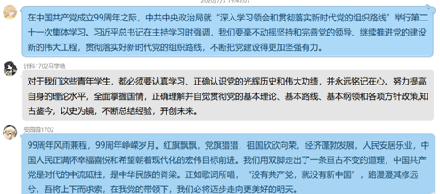 学院各党支部围绕坚定理想信念、牢记党的宗旨,践行初心使命等主题,由支部书记、党员开展了庆祝建党99周年讲专题党课活动。党课中,各支部积极组织党员开展交流讨论,充分表达对党的热爱、抒发对党的感情,不断增强坚定不移感党恩、听党话、跟党走的政治自觉、思想自觉和行动自觉。