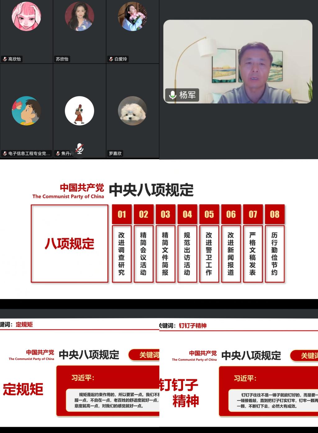 为深入贯彻中央八项规定精神学习教育,强化党员思想教育,推进作风建设常态化长效化,7月1日,电子与信息工程学院院长杨军深入联系支部开展了以中央八项规定精神为核心内容的专题党课。