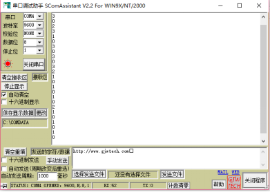 在软硬件搭建完成的基础上,需对协调器与终端节点之间的通信进行测试。协调器与PC机通过串口连接,采用串口调试小助手接收显示协调器收到的数据。各终端节点都进行了编号,1号节点响应时串口调试助手上就会显示1;2号节点响应时调试助手上就显示2,以此类推。当传感器检测到人,而串口却没有接收到相应的编号时,便可以知道该节点出现通信故障。将所有设备连接好,系统上电后,调试界面如图4.1所示: