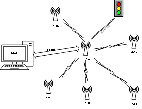 协调器与终端设备之间的通讯方式主要有:广播组网、组播组网和点播通讯。结合实际需求,本项目采用的组网方式为点播通讯。ZigBee支持星型结构、网状结构和簇状结构3种自组织无线网络类型[2-4]。结合路面实际情况,本项目采用的是星型结构,以协调器为中心,终端节点向其发送消息,其组网结构如图3.4所示,各节点在路面的分布如图3.5所示: