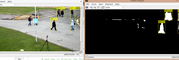 图3.1的跟踪效果良好,图3.2产生了两个问题:①中间路牌后面的两个人没有检测到,原因一是产生遮挡,二是因为他们连续静止。②编号4将两个并排走的人归为同一个目标来进行跟踪,原因是形态学操作和连通性检查没有做到太细。