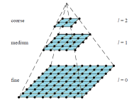 在实际的图像中,受人与摄像头的距离变化的影响,图像中的人脸有大有小,那么如何让观察窗口自动的适应人脸的大小呢?一种方法是使用多个大小不同的矩形框,依次从图像的左上角滑动到右下角。还有一种方法是将图像放缩到不同的大小,用相同的矩形框不断的去扫描。但是第一种方法并不高效,实际处理过程中选择第二种方法。图像经过第二种方法处理后会有不同大小的图像输出,将图像由大到小依次往上堆叠,就组成了一个类似金字塔的结构,所以这一种操作就叫构建图像金字塔。图像处理中最常见利用图像金字塔产生一系列不同分辨率的图像,在不同的尺度空间去寻找图像对应的特征,从而保证图像的特征一直存在。图2.2为图像金字塔示意图。