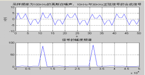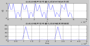 为了验证设计的FIR滤波电路是否满足设计要求,在MATLAB软件中仿真合成了一个采样频率为100KHz的高斯白噪声、10KHz正弦信号和30KHz正弦信号的测试信号,图5为测试信号量化前后的时域波形图。从图5(a)和(b)的频谱图对比可以看到测试信号中的两个主频率为12KHz和32KHz,与目标信号有所偏差,这是采样频率较低造成的,但这不影响进行仿真。表4为测试信号量化后的部分采样点数据。