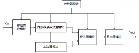 从图2中可以看到完成卷积计算需要一个计数器模块完成时序控制、一个移位寄存模块完成数据输入和移位、一个滤波器系数预置模块完成输入序列预相加的选择和系数的选择、一个加法器模块完成输入序列的预相加、一个乘法器模块和一个累加器模块,系统组成框图如图3所示。