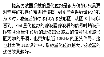 从MATLAB中的验证结果看,所设计的滤波电路对20KHz以上的高频分量具有明显的抑制效果,所以设计的滤波器是满足频率要求的。另外滤波器系数量化位数以及输入数据量化位数的提高可以提高滤波器的精度;采样频率较低不能模拟波形的真实变化,采样频率较高会影响运算速度以及资源占用,所以选择一个合适的采样频率是非常关键的。
