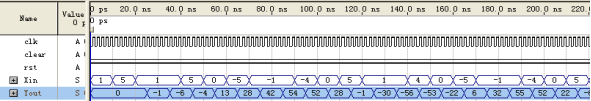 将量化得到的波形采样点数据编辑到波形仿真文件中进行功能仿真,仿真结果如图6所示。图6中Yout即为滤波器的输出,表5为滤波器的部分输出数据点,为了能够清楚的看到波形变化,在MATLAB中将滤波后的输出数据绘制成了波形图,如图7所示。