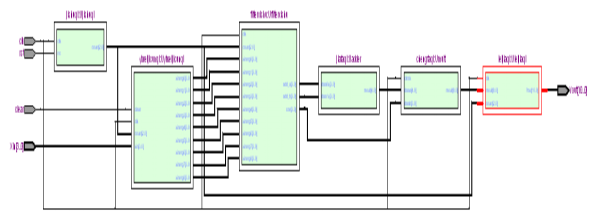 子模块和顶层的设计、编译和仿真都是在Quartus Ⅱ[6-7]环境中完成的,使用VHDL语言进行子模块和顶层的设计。顶层编译成功就会生成8阶FIR滤波器的RTL图,如图4所示 。