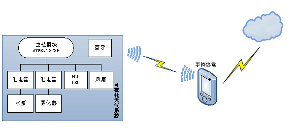 Ø 多云:系统雾化器模块工作,风扇模块不工作,不会将雾吹散,形成一朵朵的云,模拟多云的效果。