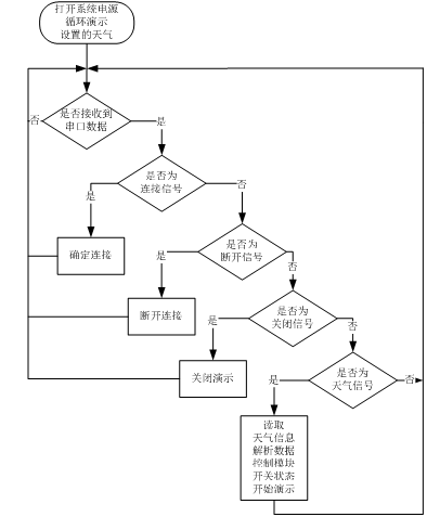 主控模块的控制流程图如图3所示。当打开电源后,初始化程序是循环演示各种天气情况,Arduino单片机进入loop主函数中,判断串口是否收到数据,如果收到数据,则分析数据的类型,并执行相应的操作。