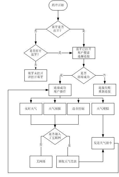 系统中所使用的安卓应用是该系统的重要组成部分之一,该应用是用JAVA语言编写的,主要功能有从互联网上获取天气数据、与Arduino的外接蓝牙进行通信、语音识别等功能。
