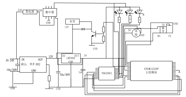 如图2所示为系统电路图。系统中所用到的功能模块有水泵、雾化器、风扇、RGB LED、蓝牙和继电器,它们的工作电压各不相同,其中水泵的工作电压为12V、雾化器的工作电压为24V、风扇、RGB LED、蓝牙和继电器的工作电压均为5V,所以所需的输入电压应为24V,使用24V直流电压电源作为输入直接与雾化器相连,通过一次降压后变为12V与水泵相连,再通过三端稳压模块进行降压后变为5V电压直接为Arduino、风扇、RGB LED以及蓝牙等模块供电。