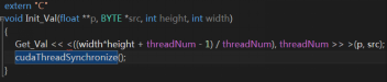 这里Get_Val就是启动函数,“<<<...>>>”内指定并行度,threadNum即为每个block启动多少线程,610m可以支持512个线程,在实际测试的过程中不是所有给的线程数越多速度越快,是一定的优化指数在影响运行的速度,而(width*height + threadNum - 1) / threadNum)则表示分配多少线程块去运行这个处理逻辑,而threadNum是每个线程快上执行多少的线程,项目中采用的是每个线程块256个显线程。
