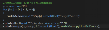 图3.2中。p为要保存的地址指针,通过循环生成9个图片大小的空间,并将地址放在p[0]-p[8],然后再对显存申请9个地址空间大小的区域p_dev,再将p的内容拷贝进p_dev中,最终的p_dev即为申请好的二级指针在显存中。