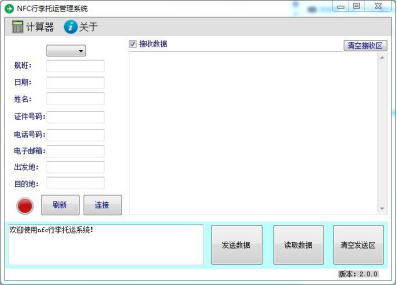 PC机客户端使用C#语言编写,用户可以通过NFC行李托运管理系统进行控制。其系统主页面如图2所示。