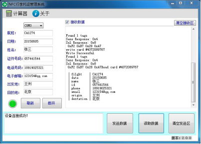 如图3所示,在系统运行时,在左边的八个文本框内分别输入“航班”、“日期”、“姓名”、“证件号码”、“电话号码”、“电子邮箱”、“出发地”、“目的地”的行李信息,将电子标签放在NFC感应线圈旁,再按“发送数据”,在右边的接受区将会显示“Write Successful”。在系统空闲的情况下,将电子标签放在NFC感应线圈旁,点击“读取数据”,就能将卡中数据读出,并传送到系统中。