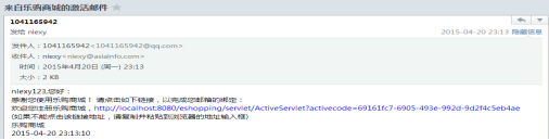 发送邮件的功能是使用QQ邮箱作为本系统的邮件服务器,在用户注册后给注册的邮箱地址发送激活邮件,邮件激活的流程主要有以下三步: