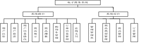 根据需求分析确定的系统功能,系统分为前台子系统和后台子系统,前台主要包括用户注册、登录、商品浏览、商品搜索、购物车管理、订单管理、在线支付等几个部分。后台子系统设计主要有管理员的管理(查看管理员信息,添加管理员、修改管理员信息);商品类型的管理(添加商品类型,删除商品类型、修改商品类型);商品管理(新增商品信息。删除商品信息、修改商品信息,查看已有的商品信息);订单管理。系统的功能架构如图2所示: