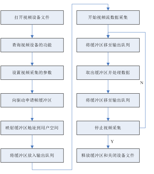 第四,驱动开始视频数据的采集,应用程序从视频采集输出队列取出帧缓冲区,处理完后,将帧缓冲区重新放入视频采集输入队列,循环往复地采集视频数据。