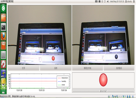 主界面左上角是监控视频区域,右上角是图像数据区域,左下角是传感器数据区域,右下角是报警区域。点击“打开”按钮,则打开摄像头,“关闭”则是关闭设像头。“查看文件夹”是查看图像存储所在的文件夹,“关闭显示”是关闭在界面上显示的图像。