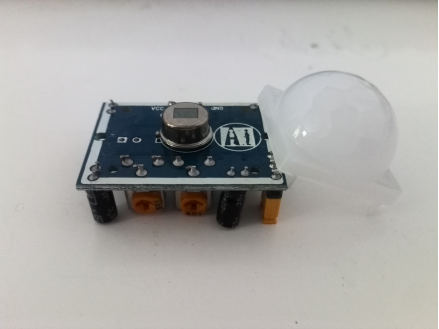 电路板上圆柱形的就是红外探头,右边半球状的就是菲涅耳透镜。传感器上只有三只引脚,分别是VCC、GND和OUT信号输出。当有人靠近传感器,OUT输出引脚会输出1,远离传感器则输出0。