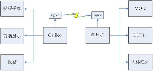 硬件方面,系统要能够完成仓库环境数据采集、传输、处理分析和报警功能。环境数据的采集依靠的是传感器,控制传感器可以使用最简单的单片机。单片机是把微型计算机中的微处理器、存储器、I/O接口、定时器/计数器、串行接口、中断系统等电路集成到一片集成电路芯片上形成的微型计算机,简称单片机。单片机属于微型计算机的一种,它集成了微型计算机中的大部分功能部件,工作的基本原理一样,但具体结构和处理方法不同。数据的传输使用目前被广泛应用的ZigBee技术。ZigBee是基于IEEE802.15.4标准的低功耗局域网协议,它是一种短距离、低功耗的无线通信技术。其特点是近距离、低复杂度、自组织、低功耗、低数据率,主要适合用于自动控制和远程控制领域。数据采集完成后将数据按照提前规定的格式,打包后由ZigBee的终端节点发送到协调器节点,协调器接收到数据后交由数据处理分析功能模块。数据处理是由Galileo可移植模块完成的,数据处理对处理器的要求比较高,因为需要读取摄像头采集的视频数据,传感器采集的数据,以及和报警模块通信,这些操作需要占用大量的CPU资源和时间,Galileo的CPU是Intel公司生产的奔腾级处理器,能够胜任这些请求。SIM900是一款能够发生短信,拨打电话的通信模块,使用它作为报警模块既经济又简单。