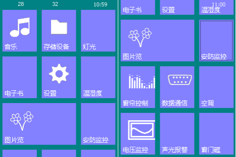 系统界面采用μC/GUI图形界面系统软件设计,完成了智能家居系统中设计的所有功能任务的操作界面,主界面如。系统采用Metro UI设计风格,支持界面的上下滑动操作,打开和关闭窗口并有过渡动画,不采用实体按键和电容触摸按键辅助界面操作。