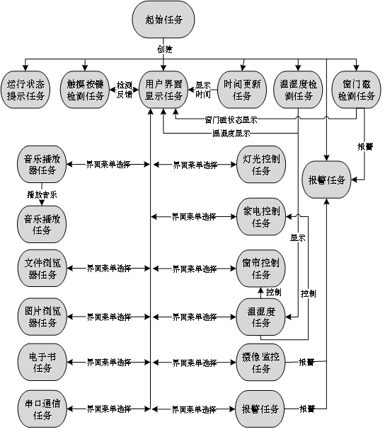 系统按照不同的功能划分为不同的模块,每一个模块完成一项具体的功能,系统分为相应的任务模块,整个系统总共分为了20个任务,包括有用户界面显示任务、触摸按键扫描任务、系统运行提示任务和时间更新任务、相关的传感器检测任务和各个功能模块任务。功能模块任务由设计的智能家居系统的各个功能模块实现,实现了家电控制、家居安防、环境检测和家庭娱乐四个部分的功能。系统任务运行流程如图5。