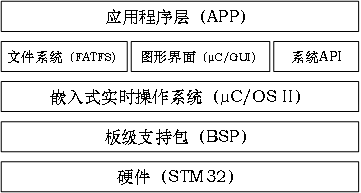 μC/OS-II是一个嵌入式可移植、可固化的、可裁剪的、占先式多任务实时操作系统,是基于优先级的可抢先的硬实时操作系统,可以运行在诸如航天飞机等对安全要求极为苛刻的环境下。嵌入式图形界面μC/GUI 是一种用于嵌入式应用的图形支持软件,μC/GUI 被设计为与处理器和LCD 控制器无关的图形用户界面,μC/GUI可以使用在单一任务和多任务环境下。FATFS文件系统是一个开源的、专门为小型的嵌入式系统而设计的FAT文件系统模块,它支持FAT12、FAT16和FAT32文件系统,可以对多个文件进行读/写。