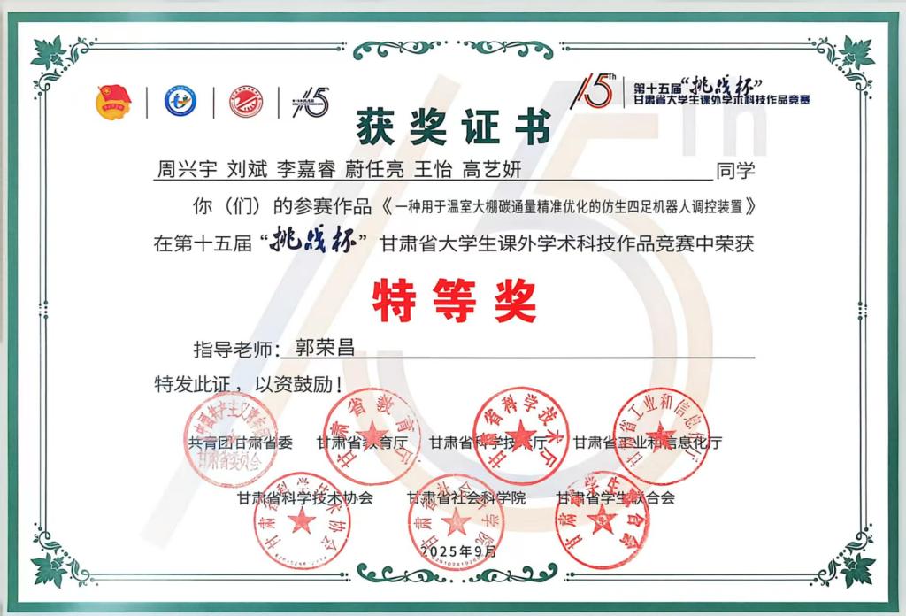 第十五届“挑战杯”甘肃省大学生课外学术科技作品竞赛已圆满结束。在这场汇聚全省高校创新力量的科技盛会上,我院学子再创佳绩,由通信工程2404班周兴宇同学担任负责人,刘斌、李嘉睿、蔚任亮、王怡、高艺妍同学共同完成的项目《一种用于温室大棚碳通量精准优化的仿生四足机器人调控装置》凭借卓越的创新性和实用性,从全省49所高校的1669件参赛作品中脱颖而出,荣获省级特等奖,展现了我院学子扎实的专业功底和卓越的创新能力。