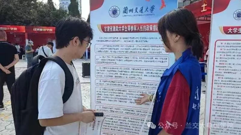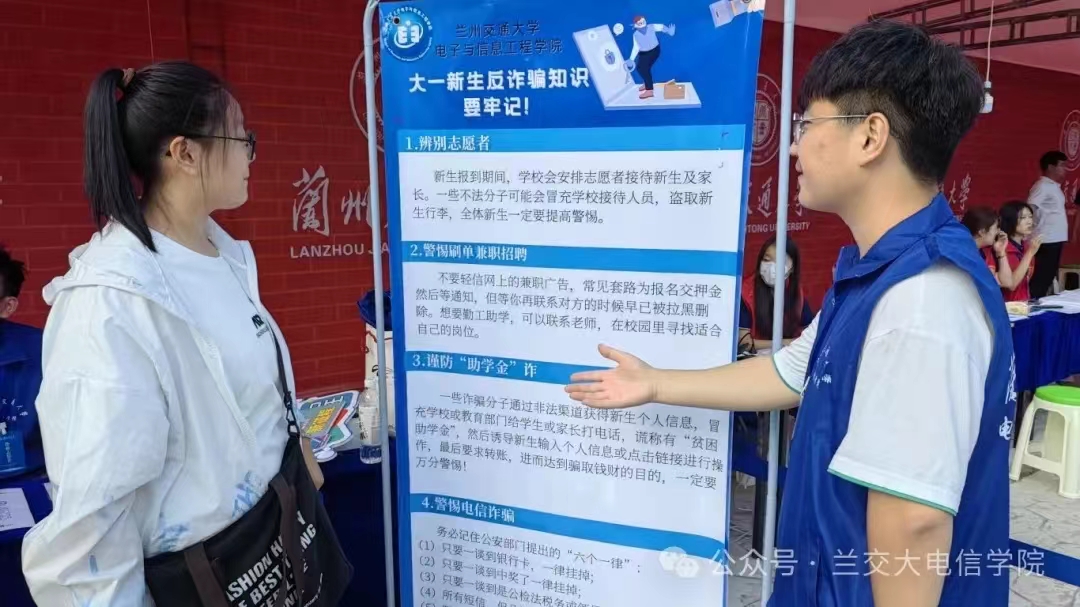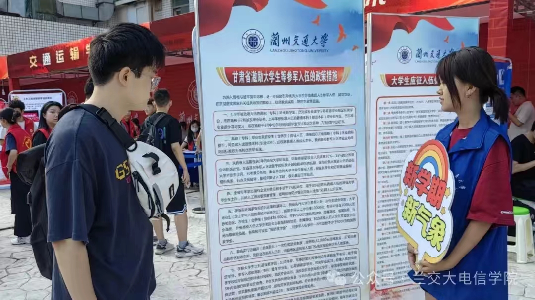 在报到点,学院设立了反诈宣传区,通过生动的案例展示、互动问答等形式,向新生们普及了防范电信诈骗的知识和技巧。志愿者们耐心讲解,提醒新生们提高警惕,增强新生的安全意识,为他们的大学生活筑起了一道坚实的防线。除此之外,报道现场还特别设置了“征兵入伍宣传”环节。志愿者们利用精心制作的展板,向新生们介绍了征兵入伍的相关知识,包括入伍条件、选拔流程、军营生活、职业发展路径等。展板上不仅有文字说明,还有图片和图表,使得信息更加直观易懂。