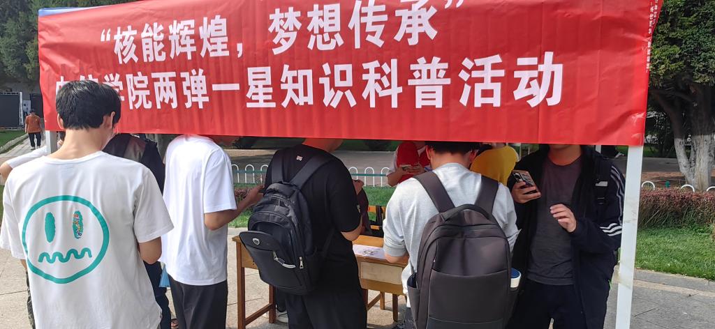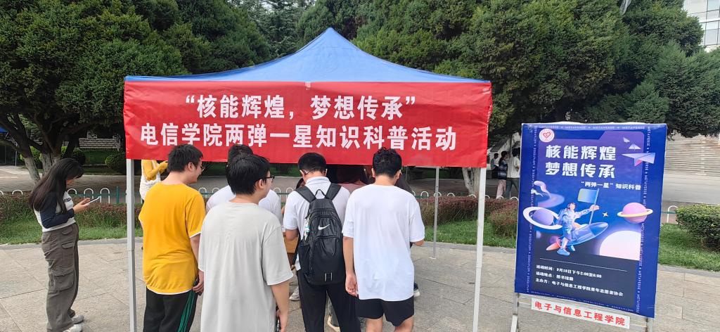 “两弹一星”作为中国科技史上的重要成就,不仅铸就了国家的安全基石,也深深烙印在每一个中国人的心中。为了缅怀先辈们的卓越贡献并传承“两弹一星”精神,兰州交通大学电子与信息工程学院青年志愿者协会于2024年9月19日在图书馆前广场举办了一场主题为“核能辉煌,梦想传承”的“两弹一星”知识科普活动。本次活动旨在通过向大学生普及科学知识,传播科学精神,激发青年学子对科学的热爱和追求。