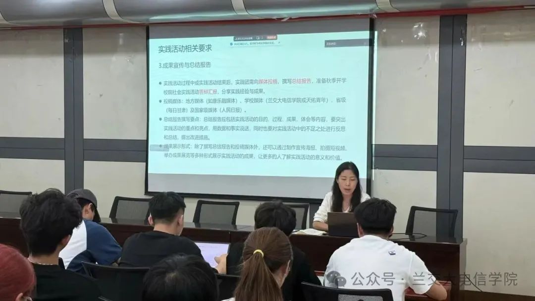 会议伊始,院团委书记杨天霞老师点明主旨,深入剖析了暑期社会实践于青年学子成长的重要意义。她指出,社会实践是青年学子将课堂所学理论知识转化为实际应用的关键纽带,通过实践,同学们能够走出校园,深入社会肌理,在亲身观察与体验中深化对社会的认知。同时,社会实践更是一座磨炼意志、凝聚团队的熔炉,能有效提升同学们的团队协作能力与实际问题解决能力,是青年学子成长成才道路上不可多得的宝贵契机。之后,杨天霞老师围绕出行安全提出具体要求。她强调,全体参与实践的同学在活动期间务必保持手机24小时畅通,确保团队能够随时取得联系;出行时必须集体行动,避免单独离队,最大限度降低安全风险。同时,同学们要根据自身身体状况,提前准备好常用药物,携带适量食物和饮用水,应对可能出现的突发情况。此外,杨老师着重指出,同学们在实践过程中,要充分尊重当地风俗习惯,始终保持礼貌谦逊的态度。参与下乡实践时,不能走马观花、流于形式,而是要用心感受当地的风土人情,通过拍照记录精彩瞬间、撰写感悟留存深刻体会,还可以在当地周边对居民进行采访,深入了解当地的发展现状和民众需求,真正做到深入实践、学有所获。