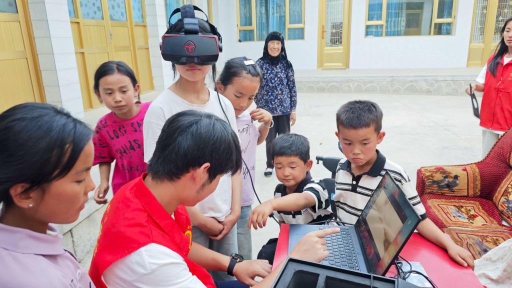 VR传情:“小手拉大手”共织温情网。7月16日,实践团带着精心准备的VR设备再次来到斜路坡村,创新采用“小手拉大手”方式,让科技成为连接代际亲情的纽带。活动前,队员们深入村小学,用生动讲解为孩子们揭开VR奥秘,并逐户确认参与意向、规划路线。在村民家中,队员们根据不同年龄段孩子的特点,播放了太空探索、名胜游览等VR内容。孩子们戴上设备后发出的纯真惊叹,好奇声如同磁石般吸引了家中老人的目光。“这是VR眼镜,就像个魔法窗户,能让娃娃看到千里之外的风景呢!”队员们用当地方言向老人亲切解释。看着孙辈兴奋的模样,老人们脸上绽放出慈祥的笑容。这一刻,科技不再是冰冷的设备,而是传递亲情、共享欢乐的温暖桥梁。