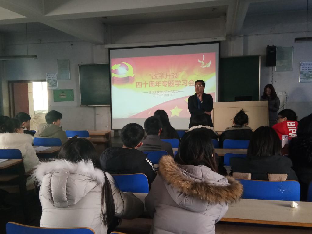 为了纪念改革开放四十周年,加深学生党员对党史、党情和国家发展的了解,增强“四个自信”。12月11日中午,通信工程专业第一党支部组织全体党员,在7教1401召开改革开放四十周年专题学习会,并观看了央视大型纪录片《我们一起走过———致敬改革开放40周年》。专题学习会由学院党委副书记副院长、通信专业第一党支部书记陈浩老师主持。