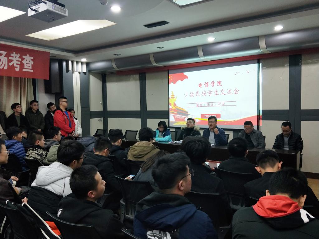 11月26日晚21时,电信学院在5楼大会议室召开学院少数民族学生交流会,了解少数民族学生在校的学习、生活情况。学院党委副书记、副院长陈浩老师及全体学生工作人员出席会议,会议由院学生办公室主任马良斋老师主持,全院171名少数民族学生参加交流会。