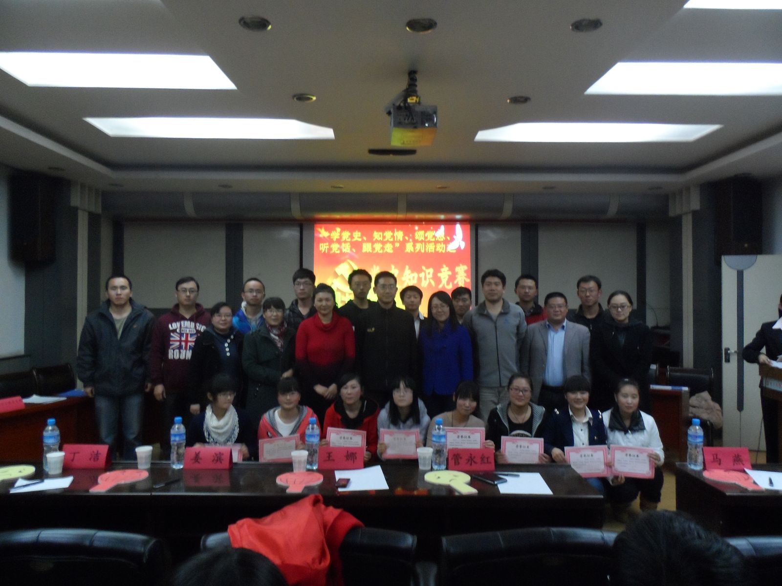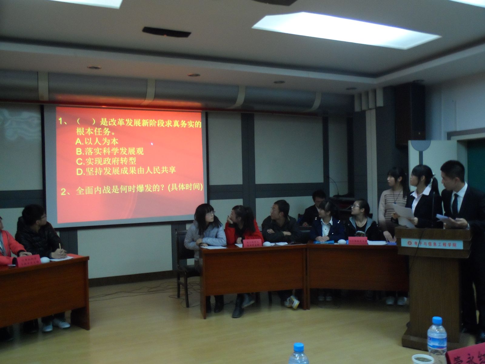 为庆祝党的十八大胜利召开,重温党的光辉历程,帮助同学们更好地掌握党的基本理论知识和学习宣传十八大精神,进一步激发全院同学的爱国热情和民族自豪感,努力营造创新争优、共谋发展的良好校园氛围,11月20日晚,由电信学院党委主办、团委承办、学生会协办的“学党史、知党情、颂党恩、听党话、跟党走”系列活动之党史知识竞赛成功举行,本次活动邀请到了学校人组部、团委、学生处相关负责人担任评委及嘉宾,学院党政领导及组织员、辅导员与学生代表参加并观看了本次活动。