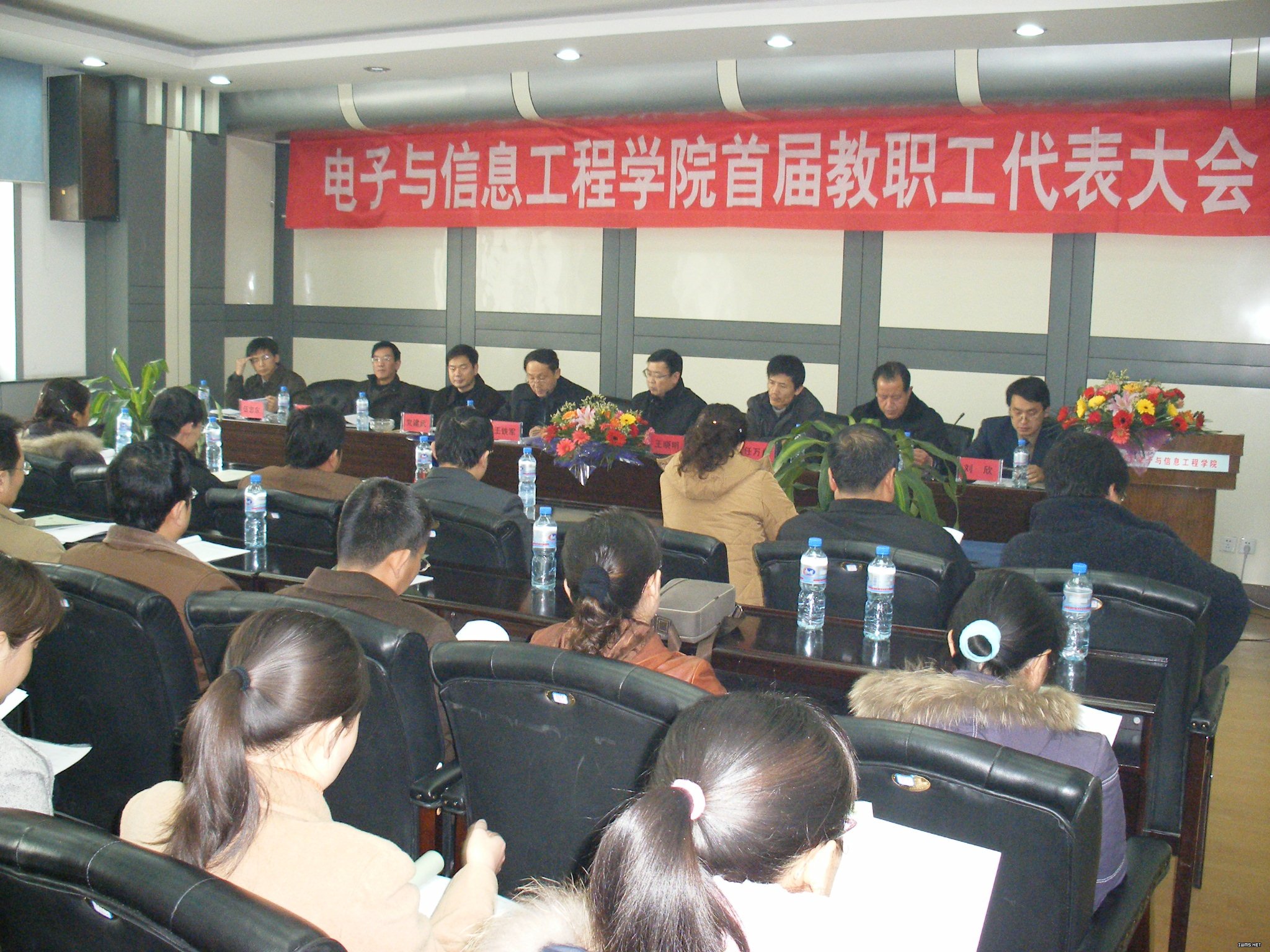 12月14日,电子与信息工程学院首届教职工代表大会在电信学院五楼会议室召开。校常务副校长王晓明同志、校党委副书记王铁军同志、校工会主席任万勇同志应邀出席了大会并分别讲话,向大会表示祝贺,预祝大会圆满成功。
