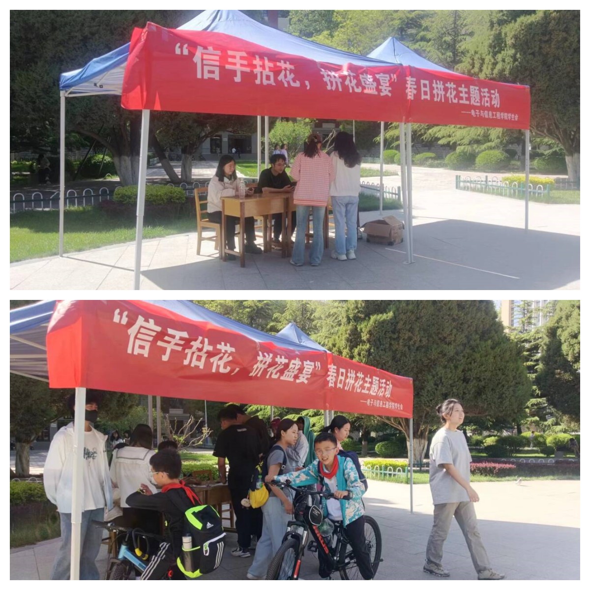 为进一步提高大学生艺术文化素养,活跃校园文化生活。电子与信息工程学院于4月25日下午在我校逸夫图书馆广场举办了一场别开生面的春日拼花主题活动。活动吸引了数百名同学驻足和参与,这场以“信手拈花,拼花盛宴”为主题的活动,为同学们带来了一场视觉与创意的盛宴,让春日的美丽在同学们的手指间、在同学们的嬉笑中绽放。
