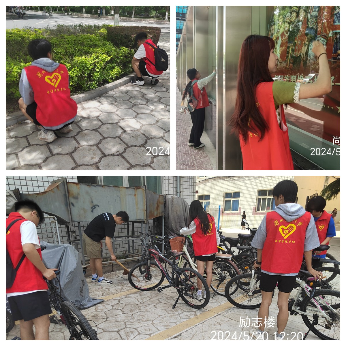 中午十二点半,同学们准时在电信楼下集结,他们身着统一的志愿服,听从活动负责人的统一调配,以饱满的热情投入到公益活动中。尽管当日天气炎热,但同学们的热情丝毫不减,在同学们的共同努力下,电信楼下的自行车被摆放得井然有序,钟楼的外墙也被擦拭得一尘不染。随后,同学们又赶往交大礼堂,用扫把将积水的台阶清扫干净,同时还清理了对面马路上的垃圾,细心地擦去了尚德楼下窗台与玻璃上的灰尘。最后,同学们将志愿服整齐折叠,把打扫工具妥善归还给活动负责人,本次活动顺利结束。本次志愿活动不仅为师生创造了一个更加整洁的校园环境,还提高了同学们的社会责任感,培养了同学们的奉献精神。更重要的是,通过这次活动,同学们之间的友谊得到了进一步加深,班级的集体荣誉感和使命感也得到了显著提升。