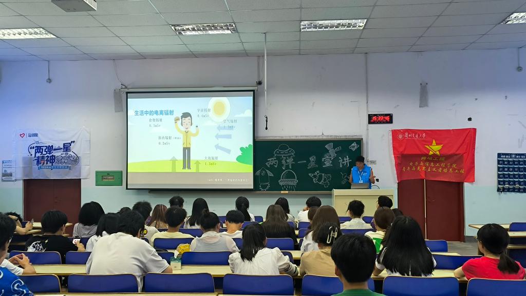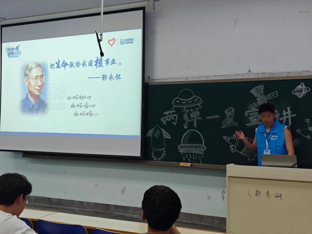 本次宣讲共分为三个部分,宣讲内容丰富,为师生们带来了一场精彩纷呈的精神洗涤。活动伊始,宣讲团介绍了两位杰出科学家郭永怀和王淦昌的伟大事迹,生动诠释了两弹一星精神的深刻内涵。他们的事迹不仅体现了科学家们坚定的信念追求与拳拳爱国之心,更为我们树立了崇高的榜样。然后,宣讲团成员对生活中的核辐射进行了详细讲解。通过通俗易懂的语言和生动的实例,向大家科普了核辐射的来源、种类及其对人体的影响,以及如何在日常生活中科学防护核辐射。这一环节不仅增加了同学们的理论知识,更提高了大家的防护意识。最后,宣讲团回顾了党领导下中国核工业的发展历程。从第一颗原子弹的成功爆炸,到如今核技术的广泛应用,宣讲团用详实的数据和生动的图片,展示了我国核工业在党的领导下取得的辉煌成就。通过这一环节,大家深刻认识到党的正确领导是我国核工业迅猛发展的根本保证,激发了同学们对党和国家的深厚情感。宣讲结束后,同学们纷纷表示,将以两弹一星精神为指引,努力学习,勇于创新,为实现中华民族的伟大复兴贡献自己的力量。