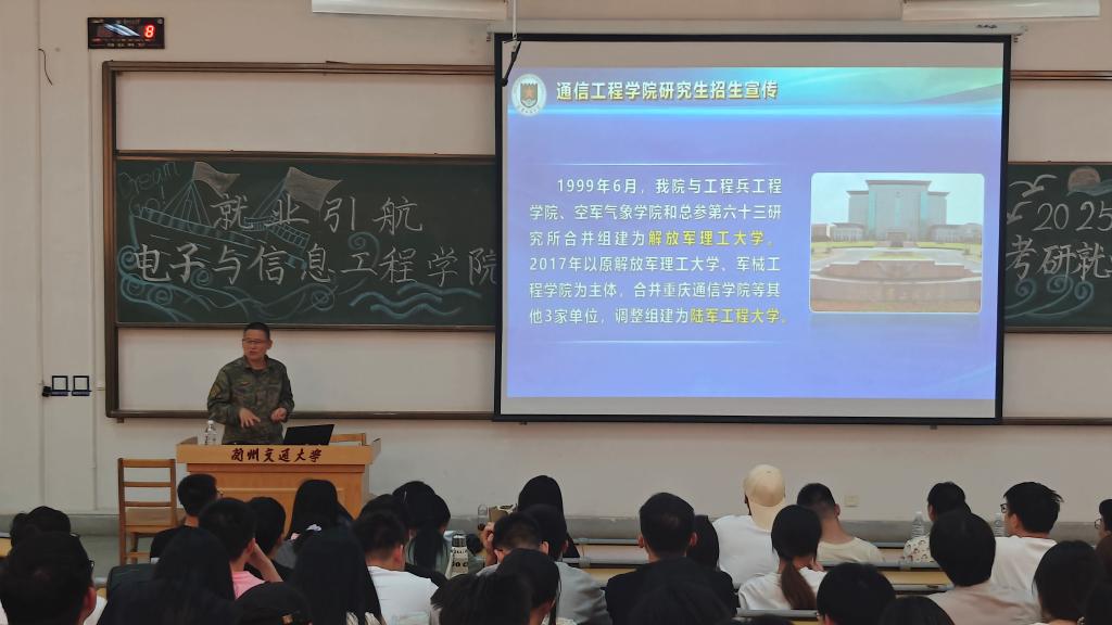 随后由陆军工程大学郭道省教授进行考研宣讲,同时他也是通信工程学院某教研室教员,获国家科技进步二等奖1项、军队科技进步一等奖2项、军队科技二等奖5项,发表学术论文50余篇,授权专利15项。郭教授在军队科研领域成果丰硕,承担了多项军队重点科研项目,在交流会上,郭教授首先详细介绍了陆军工程大学建校历史、本校通信工程专业在军事领域的突出贡献、代表性成果以及本校培养的杰出校友,展示了陆军工程大学在学科建设上的优势与特色。接着郭教授为大学生们解读了部队在地方大学招收硕士生和博士生的相关政策、录取要求和毕业条件并对同学们提出了许多宝贵的建议。最后郭教授勉励同学们坚定信心,持之以恒,为实现自己的梦想而努力奋斗。