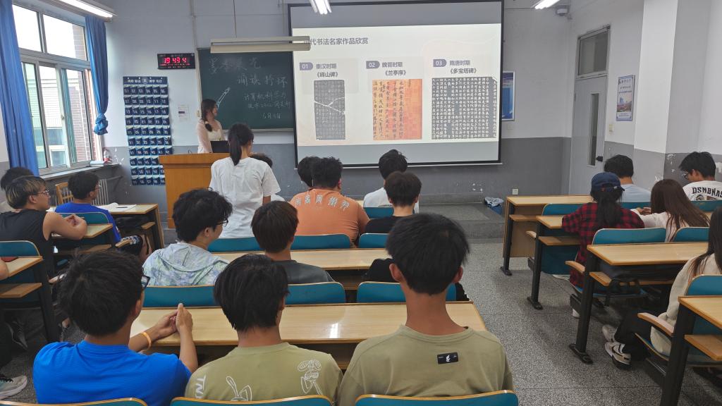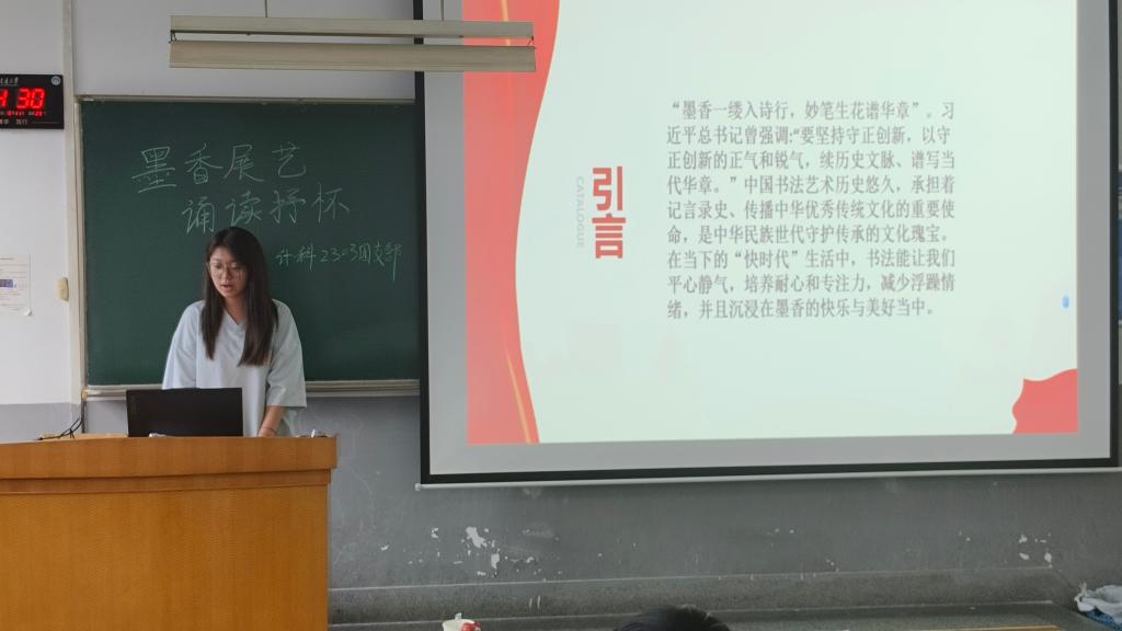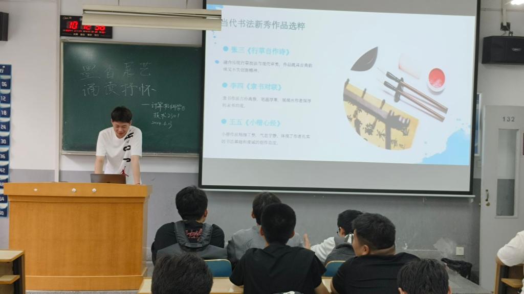 计算机科学与技术2302的团支书则带领同学们欣赏了《峄山碑》、《兰亭集序》、《多宝塔碑》等著名书法名家作品,号召同学们学习书法,欣赏书法。接着通过互动的方式让台下同学们朗读古诗与散文,如《念奴娇·赤壁怀古》、《再别康桥》等,使同学们亲身体会诵读之乐趣。最后提出诵读与书法相结合的方式学习文学名篇,领悟其内在感情,从而更好的体会其中包含的深刻内涵。