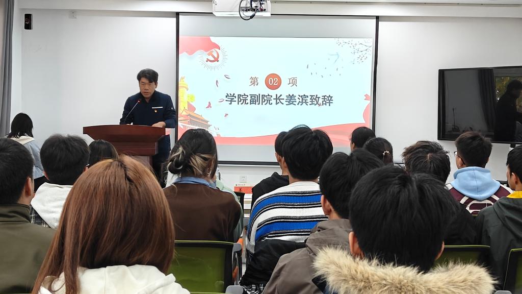 仪式在激昂的国歌声中拉开序幕。首先,学院副院长姜滨老师为开班仪式致辞。姜院长对我院第三期“青马工程”的培训成果给予充分肯定,同时对第四期“青马工程”培训班学员提出三点希望;第一,融入国家发展伟业,立志成为堪当大任的栋梁之才;第二,珍惜培训班提供的理论学习、实践参与和思想交流平台,沉下心系统学习党的理论成果;第三,坚持知行合一,勇担重任,做矢志奋斗的先锋,成长为真正的青年马克思主义者。