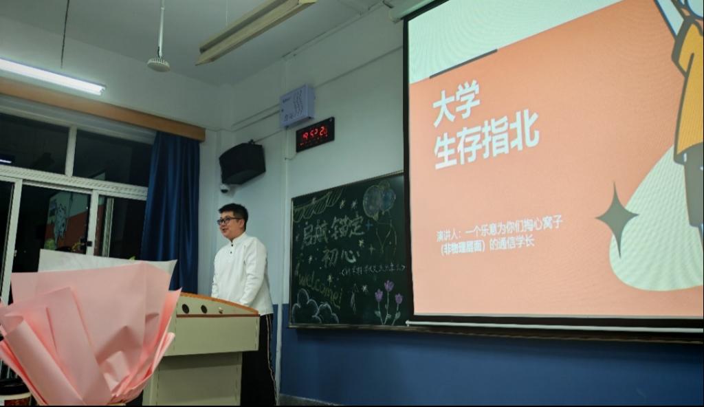 “此刻的我们,正站在大学这幅崭新画卷的起点……”伴随着主持人(李明轩、秀佳仪)热情洋溢的开场,分享会正式拉开帷幕。他们以“新大陆旅人”的生动比喻,道出新生对大学的憧憬与对未知的思量,也点明这场分享会【启航·锚定初心】所蕴含的“传经送宝、助力成长”的核心意义——让过来人的经验成为新生们解锁大学“通关秘籍”的钥匙。随后,2025级通信工程01班(茅)班主任杨建辉老师介绍了与会嘉宾、班风建设及班徽LOGO内涵,并寄语“以通明之心,创未来之信。希望大家通过此次分享会,锚定初心,摒弃迷茫,珍惜时光,无悔青春”。
