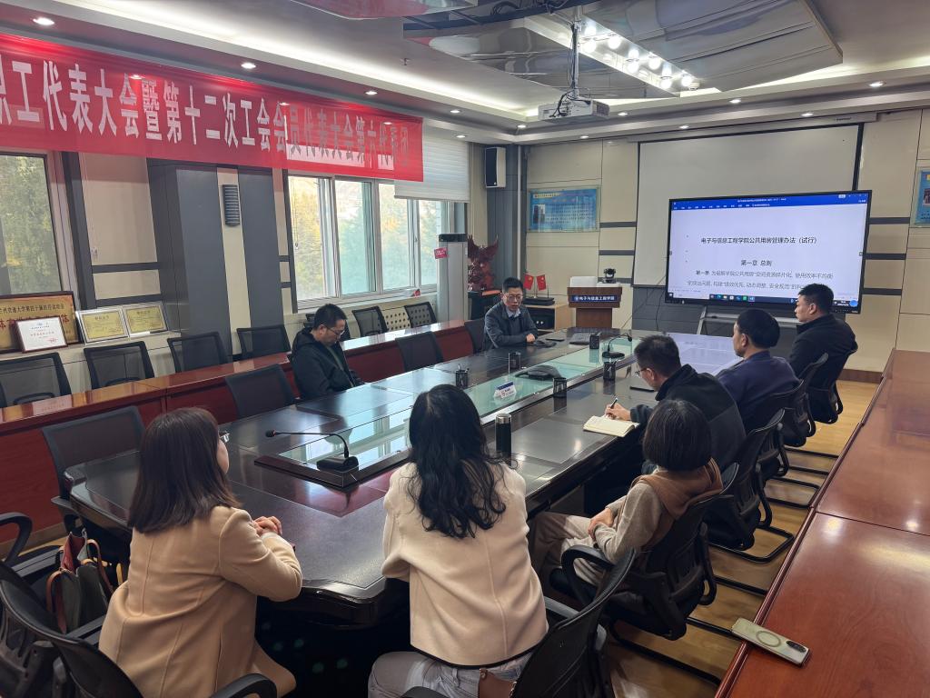 10月30日下午,电子与信息工程学院在励志楼508召开学院教职工代表会议,专题审议《电子与信息工程学院公共用房管理办法(试行)》。会议由学院党委书记赵庶旭主持,申东、李积英、杨艳春、杨桂芹、郭治成、王耀琦、魏孔庭等教师代表共同参与讨论。