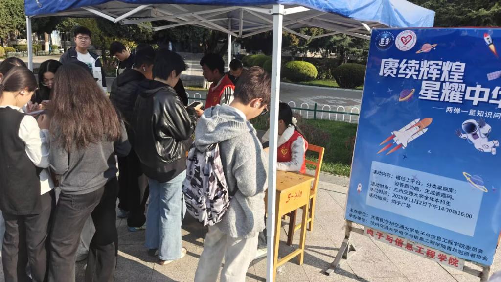 为重温新中国科技发展史上的辉煌篇章,让“两弹一星”精神在新时代青年中薪火相传,进一步增强同学们的民族自豪感与历史使命感,2025年11月2日下午14:30至16:00,由共青团兰州交通大学电子与信息工程学院委员会主办、学院青年志愿者协会承办的 “赓续辉煌,星耀中华”“两弹一星”知识问答活动,在鸽子广场顺利开展。活动吸引了全校200多名同学参与,在知识竞答中回望历史,汲取奋进力量。