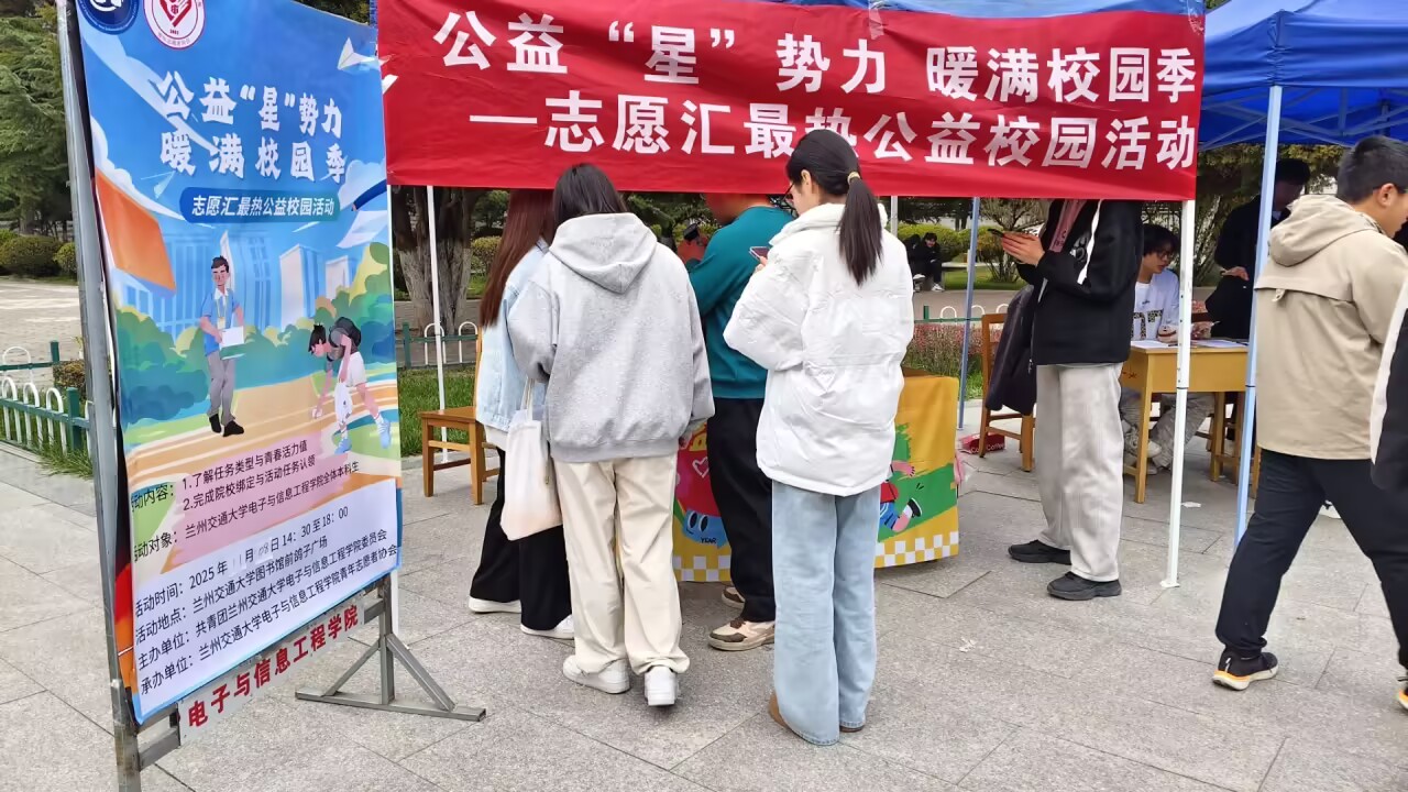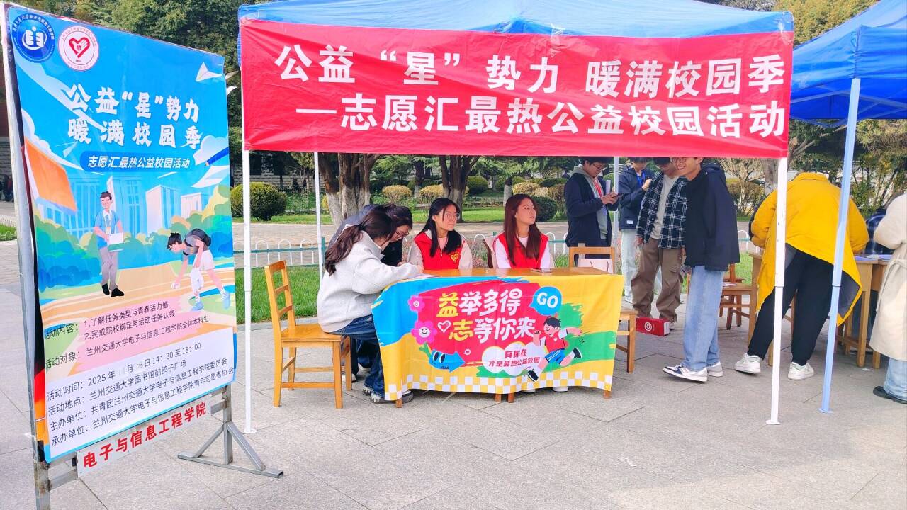 为全力协助“志愿汇”平台“最热公益校园”活动落地见效,切实解决同学们在活动参与中遇到的规则困惑与操作难题,兰州交通大学电子与信息工程学院青年志愿者协会于2025年11月8日14:30至18:00在学校图书馆前鸽子广场成功举办“公益‘星’势力,暖满校园季”的线下推广活动。