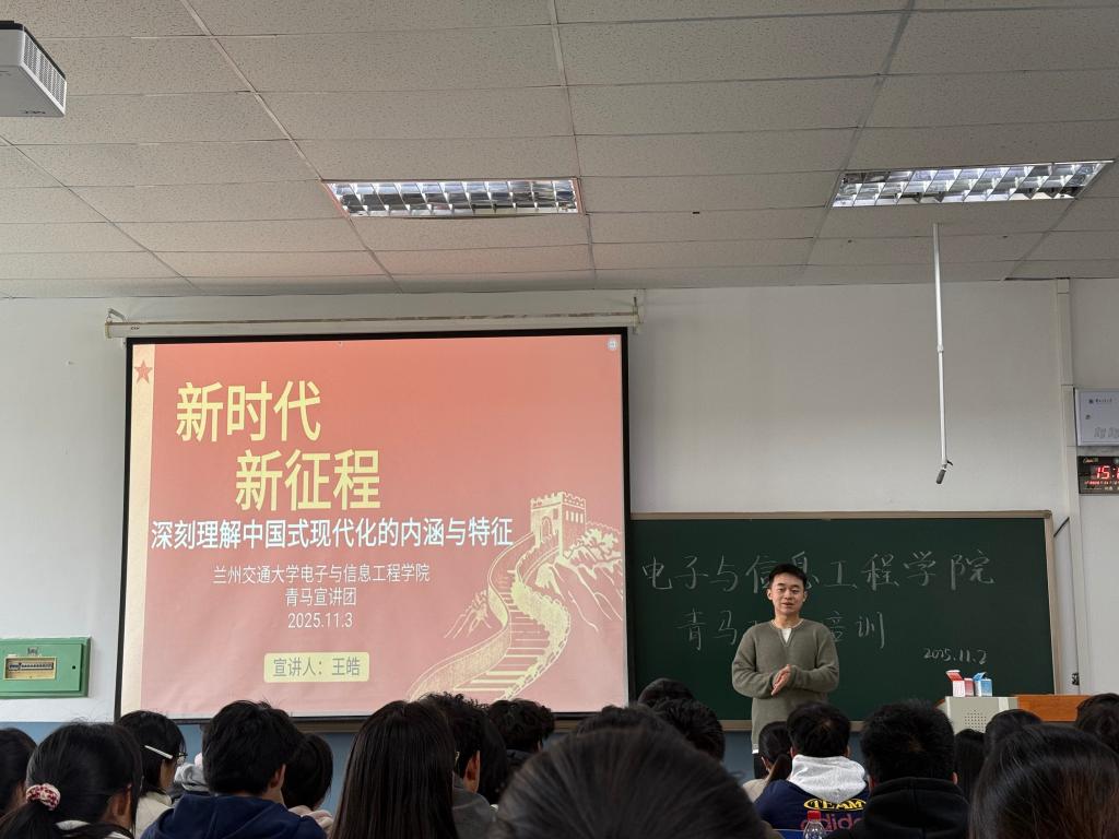 2025年11月3日,兰州交通大学电子与信息工程学院第四期“青马工程”培训班第一次理论课在第七教学楼1803教室正式开讲。学院青马宣讲团成员王皓以“新时代新征程——深刻理解中国式现代化的内涵与特征”为主题,为全体学员带来了一场系统深入的理论导学,开启了本期培训班的理论学习与思想淬炼之旅。